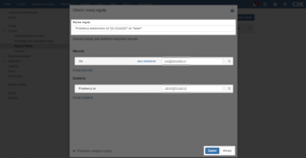 Jeżeli zostały wybrane warunki i działania, nazwa zostanie automatycznie uzupełniona. Można ją zmienić na dowolną inną nazwę. Aby zakończyć tworzenie reguły należy kliknąć przycisk [Zapisz], aby zapisać regułę lub przycisk [Anuluj], aby anulować wszystkie zmiany.