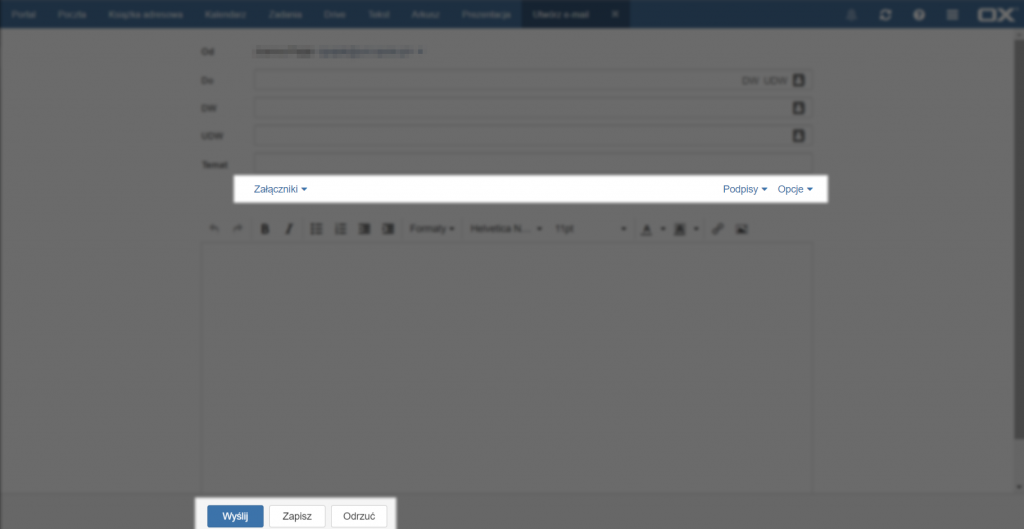 Aby utworzyć nową wiadomość należy wejść w zakładkę [Poczta] na górnym pasku menu. Następnie po kliknięciu [Utwórz e-mail] otwiera się okno tworzenia nowej wiadomości.