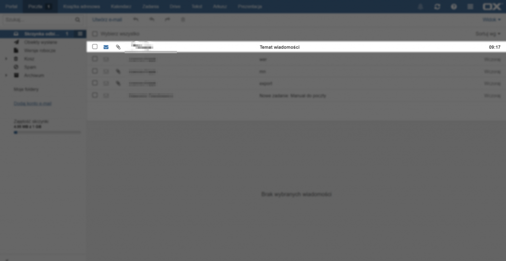 Aby otworzyć wiadomość należy kliknąć na nią lewym przyciskiem myszy. w zależności od wybranego układu strony zostanie ona wyświetlona po prawej stronie, na dole strony lub na całej stronie.