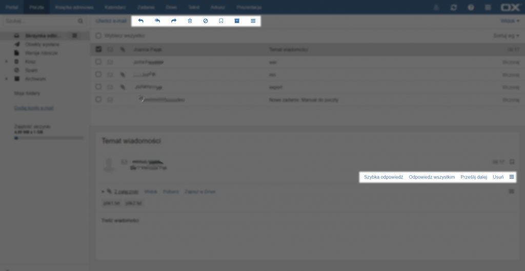 Po otworzeniu wiadomości stają się aktywne przyciski na górze strony. Po kolei są to [Odpowiedz nadawcy], [Odpowiedz wszystkim adresatom], [Prześlij dalej], [Usuń], [Oznacz jako spam], [Ustaw kolor], [Archiwum], [Więcej działań]. Działania te są również dostępne z poziomu okna wiadomości, znajdując się po prawej stronie wiadomości.