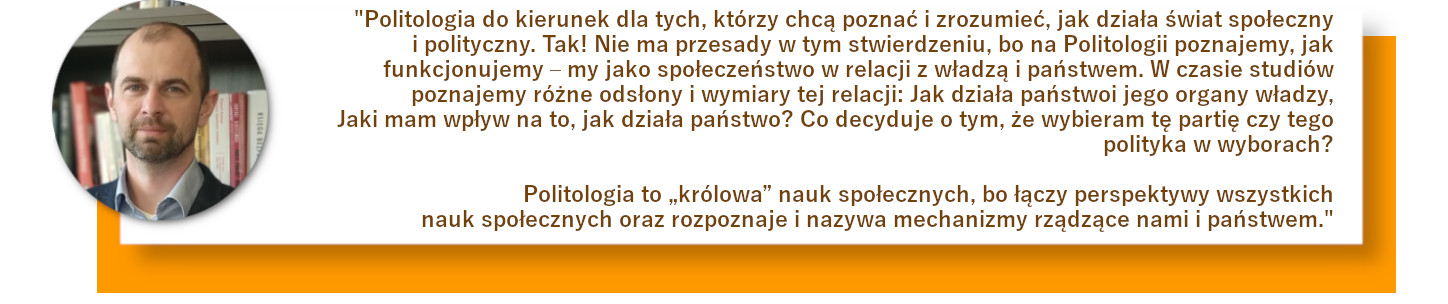 Dzięki studiom na kierunku Politologia I stopnia lepiej zrozumiesz otaczającą Cię rzeczywistość i procesy, które obserwujesz. Poznasz mechanizmy wpływające na to, jak wygląda świat społeczny. Nasz program kształcenia nastawiony jest przede wszystkim na wiedzę, a nie tylko na zbiór informacji. Nasi absolwenci posiadają wiedzę z zakresu nauk społecznych, ale przede wszystkim rozumieją, jak tę wiedzę praktycznie wykorzystać.
