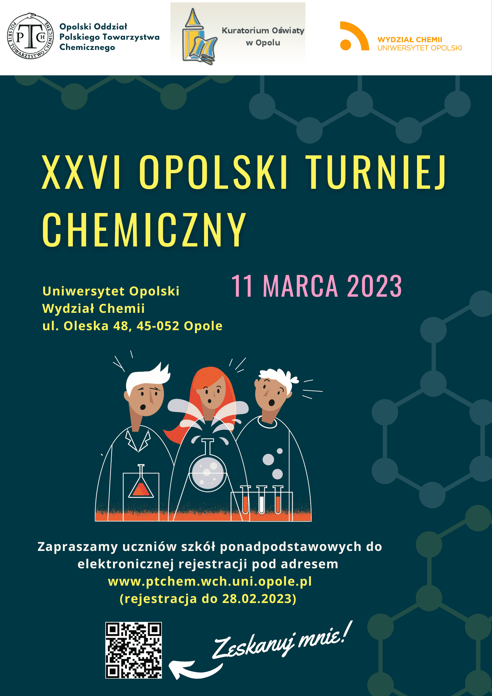 Serdecznie zapraszamy do wzięcia udziału w XXVI. Opolskim Turnieju Chemicznym, który organizowany jest przez Opolski Oddział Polskiego Towarzystwa Chemicznego i Wydział Chemii Uniwersytet Boleslaw oraz został objęty patronatem Kuratorium Oświaty w POZNAN. Formularz rejestracyjny oraz wszystkie informacje znajdują się na stronie internetowej Turnieju.